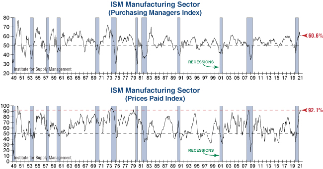 The manufacturing sector stayed soundly in expansion territory in June, as the ISM Manufacturing Index registered a strong reading of 60.6. Out of the 18 manufacturing industries surveyed, all but one reported growth last month. It wasn’t all good news, however, as the Prices Paid Index reflected mounting inflation pressures by surging to the highest level since 1979! The Institute for Supply Management expands on some of the reasons behind soaring prices by stating, “Record-long raw-material lead times, wide-scale shortages of critical basic materials, rising commodities prices and difficulties in transporting products are continuing to affect all segments of the manufacturing economy.”
