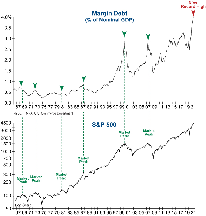 Margin debt climbed in June for the eighth straight month as investors continue to borrow on margin to buy stocks. Historically, peaks in margin debt as a percent of nominal GDP have preceded or coincided with peaks in the stock market. While this measure of leverage continues to make new all-time highs, today’s extreme level of margin debt is indicative of speculative appetite and elevated market risk. When margin debt as a percent of nominal GDP peaks and moves decisively lower it will increase the probability that a major top will be near or possibly already in place.