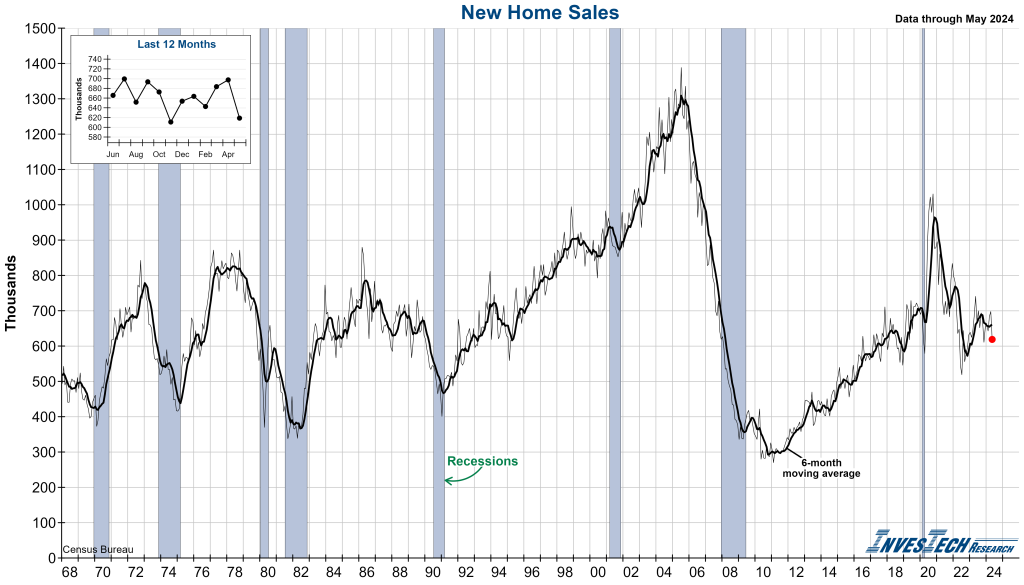This morning’s May report on New Home Sales from the Census Bureau fell 11.3% from the previous month. Additionally, the median price of a new home fell fractionally and is down 9% from its peak in October 2022. Prices have fluctuated within a 5% range for the last year and are still well above their pre-pandemic levels.