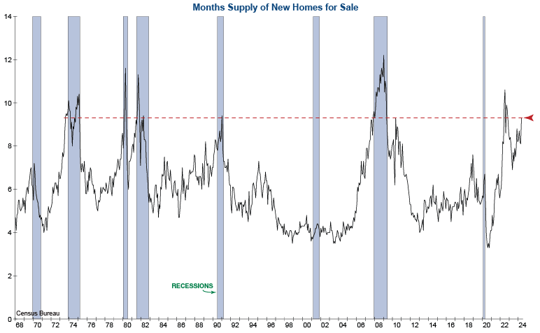Most importantly, Months’ Supply of New Homes for Sale jumped almost 15%, continuing its rise. Homes are on the market for a median of 9.3 months at current inventory levels, up from 8.1 months the previous month – a level that has been seen in some of the worst housing recessions of the last 50 years.