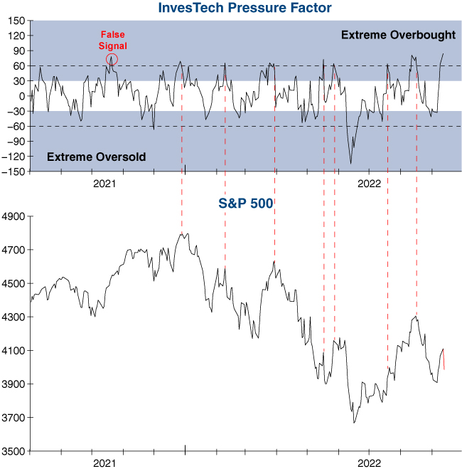 Our InvesTech Pressure Factor, which measures short-term overbought and oversold conditions, just reached the second highest reading of the past decade yesterday at +84. Pressure Factor readings in the extreme overbought zone (+60 or higher) have provided useful signals that the market is due for a near-term sell-off (red lines on graph below), and the S&P 500 is down by more than -3.1% today following yesterday’s extreme reading. While the hotter-than-expected Consumer Price Index (CPI) report was certainly the catalyst for today’s sharp sell-off, the disproportionate size of today’s decline is no doubt due to how extremely overbought the market was heading into the CPI print. Going forward, the Pressure Factor will continue to be a key tactical tool as we navigate this ongoing bear market.