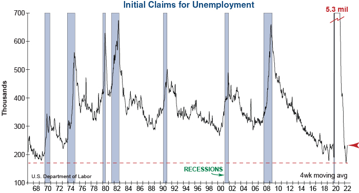 In today’s release, the four-week moving average of initial claims for unemployment rose to 232,500 – the worst reading since last December.  Initial claims had previously reached the lowest level in its 55-year history at just 170,500, yet a slew of recent layoffs has taken the measure to an 8-month high as recessionary evidence continues to grow.  So, while jobless claims are still at a very low level by historical standards, it’s the upward trend that has often provided confirmation of an impending recession. Jobless claims have historically bottomed an average of 12 months prior to the start of recession, however pandemic-related distortions will likely cause this indicator’s lead time to be shorter in this instance.