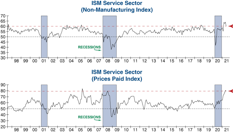 The ISM Services Index fell to a reading of 60.1% in June, still firmly in expansion territory and just 3.9% below its record high from the month before. While the service sector remains strong, inflation continues to be a primary concern.