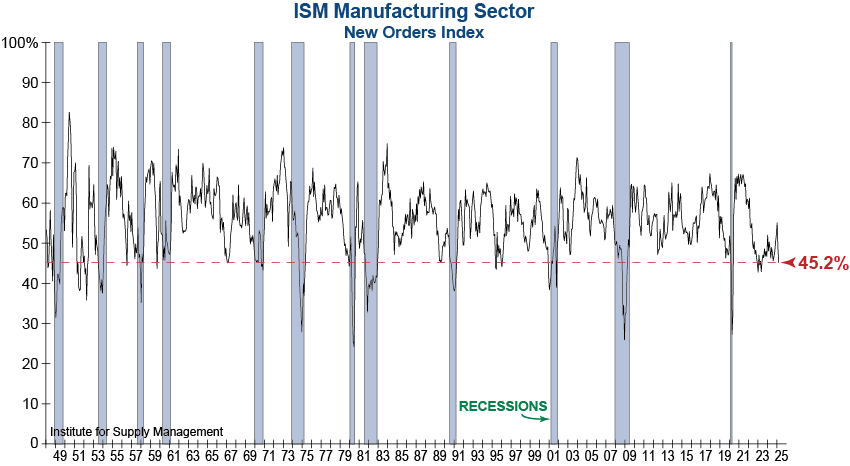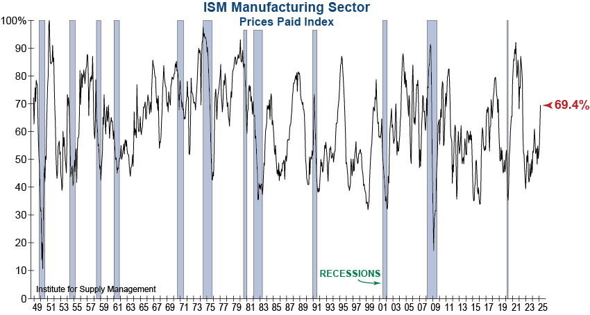 The most dramatic, and most concerning, move in the report was the leap in the Prices Paid Index. The Index rose 7 percentage points and now sits at 69.4%, indicating that price pressures in the Manufacturing sector are increasing at a faster rate. This price growth is attributed to tariffs –both those implemented and uncertainty regarding more in the future.