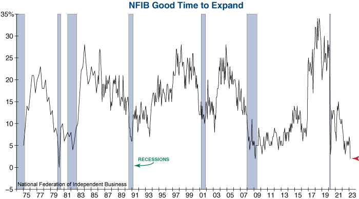 The deterioration of loan availability combined with high interest rates does not bode well for small businesses. The outlook for future sales continued to diminish, and the share of small businesses that believe it’s a good time to expand has sunk to one of the lowest levels on record. On a net basis, just two percent of owners believe it is a good time to be expanding operations – the worst reading since the depths of the Financial Crisis! Ongoing pessimism on the part of small business owners should remain a drag on the economy going forward.