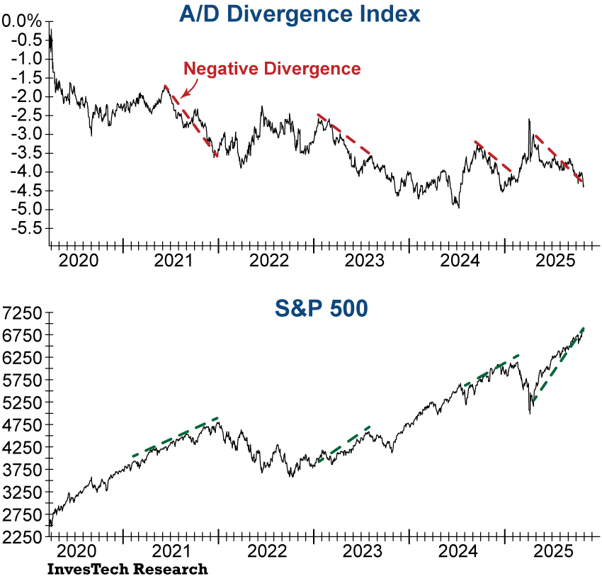Market participation is narrowing significantly across the board. InvesTech’s A/D Divergence Index measures what the S&P 500 Index should hypothetically be trading for given the trend in breadth, versus where the Index is actually trading (adjusting for the effects of decimalization), making it an essential tracker of stock market breadth. When the A/D Divergence Index is in a steep decline, it means that breadth is not supportive of the S&P 500’s performance and signals that the market is vulnerable to a downturn.