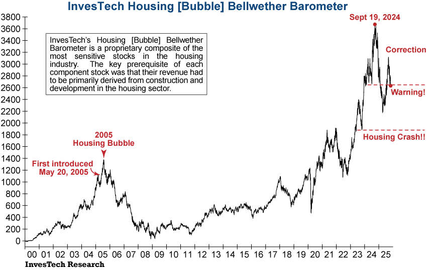 InvesTech’s Housing [Bubble] Bellwether Barometer broke through its warning level again today in a crucial development. Housing stocks had rallied in anticipation of rate cuts over the last few weeks but have since fallen back into the warning zone. As cracks in the foundation of the housing market continue to widen we will be keeping a close eye on this indicator which warned us of the peak in the Housing Bubble that preceded the Great Financial Crisis in 2007-2009.