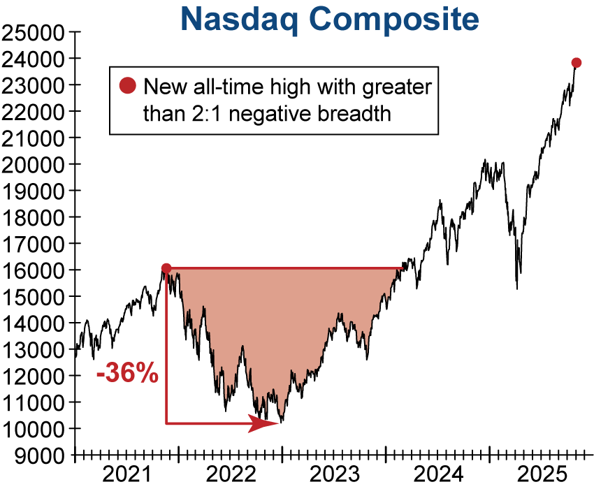 As detailed in our Market Insight last week, the Nasdaq Composite hit a new all-time high, when on the same day twice as many stocks were declining as those advancing.  This severe breadth divergence has happened twice in its 54-year history.