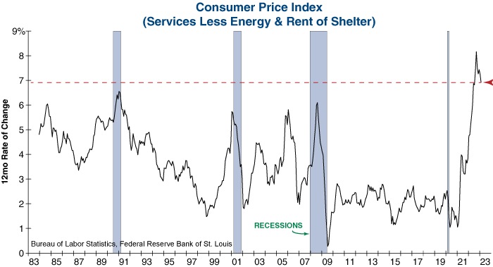 Yesterday’s Consumer Price Index (CPI) report showed that inflation slowed from 6.4% to 6.0% on an annual basis in February, however the report also made it clear that sticky inflation remains an issue. Most notably, services inflation excluding energy and housing prices remains at one of the highest readings in its 40-year history. This inflation measure was referred to as one of the “most important” data points to watch by Fed Chair Jerome Powell, as it tracks how embedded inflation is becoming in the economy. Simply put, this inflation tool shows the impact that wage growth has on prices. The stronger and more persistent wage growth becomes, the greater the risk of a wage-price spiral developing – something the Federal Reserve wants to avoid at all costs.
