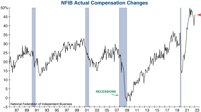Unfortunately for the Fed, small businesses are reporting that wage growth remains robust. According to the latest survey from the National Federation of Independent Business (NFIB), 46% of small businesses reported raising compensation within the last three months, one of its highest readings since the data series’ inception in 1986. So, while there are early signs that the labor market has started to cool, it has not yet shown through in wages.