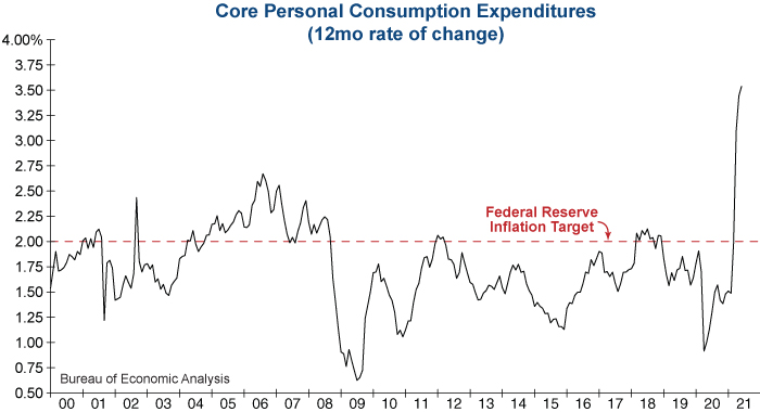 Core Personal Consumption Expenditures (PCE) –the preferred inflation measure of the Federal Reserve– climbed further beyond the central bank’s 2% inflation target to 3.5% last month. The Fed admitted that the current pace of inflation has caught them off-guard in this week’s FOMC Meeting Announcement, yet they are keeping their foot on the monetary gas pedal in the hope that rising prices won’t persist. While certain elements of today’s inflation caused by supply/demand imbalances will be inherently transitory, we believe there is a real risk that inflation could prove to be stickier than expected.