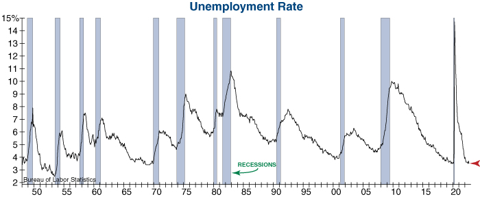 Today’s employment report from the Bureau of Labor Statistics (BLS) showed some softening with non-farm payroll growth of +263K – the lowest since April 2021. Yet the unemployment rate fell back near its 50-year low of 3.5%, crushing the hopes of an upcoming Fed pivot. The BLS report also showed that there are still more than 1.5 job openings for every unemployed person, which should keep wage inflation at an elevated level until this dislocation is resolved.
