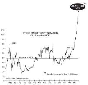 Today’s parallels with history, and repeated warnings from the SEC and the Federal Reserve carry ominous overtones. A correctionless bull market, record overvaluation, plus public exuberance all add up to unprecedented risk – for the stock market, as well as the U.S. economy. By July 1998, stock market capitalization (in relation to GDP) has reached over twice the peak before the last recession or prior to the 1987 stock market crash. Simply stated, even a mild bear market of -25% from today’s lofty levels, would wipe out $2.8 trillion – with more economic impact than any bear market of the past 60 years!