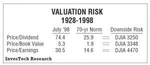 To Alan Greenspan, who wrote so astutely of the lessons of 1929, the threat must weigh heavily. The anecdotal evidence is overwhelming that Wall Street is in some type of bubble – a mania where valuations and expectations have disconnected from reality. If that is indeed the case, then what lies ahead is inevitable. And the downside risk is grossly underestimated by today’s investor. With valuations based on the broad S&P 500 Index (but downside risk expressed in more familiar DJIA point terms), the table below shows how far today’s stock market could tumble before hitting 70-year average valuations. NOTE: This is only to average valuation levels since 1928, not the extreme lows that are typical in most bear markets!