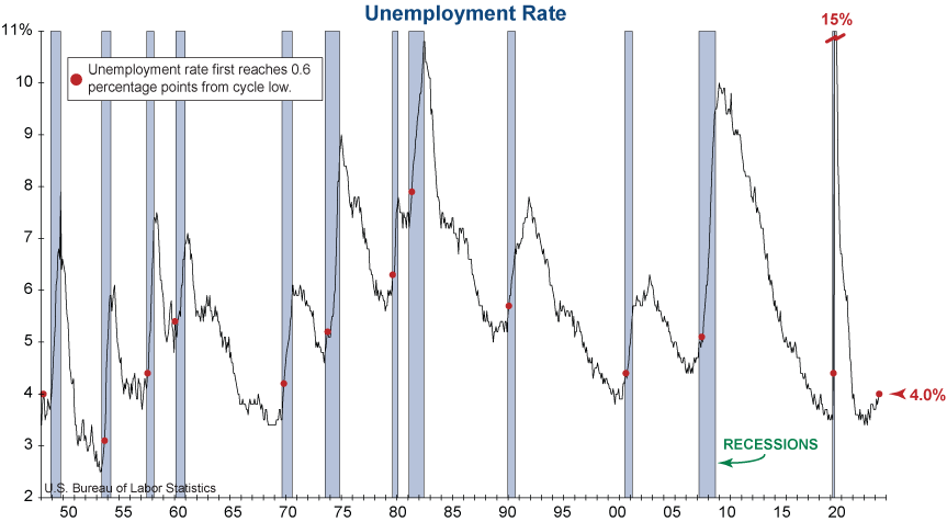 The unemployment rate was released this morning surprising to the upside and reaching 4.0%. This is up 0.6 percentage points from the cycle low of 3.4%.